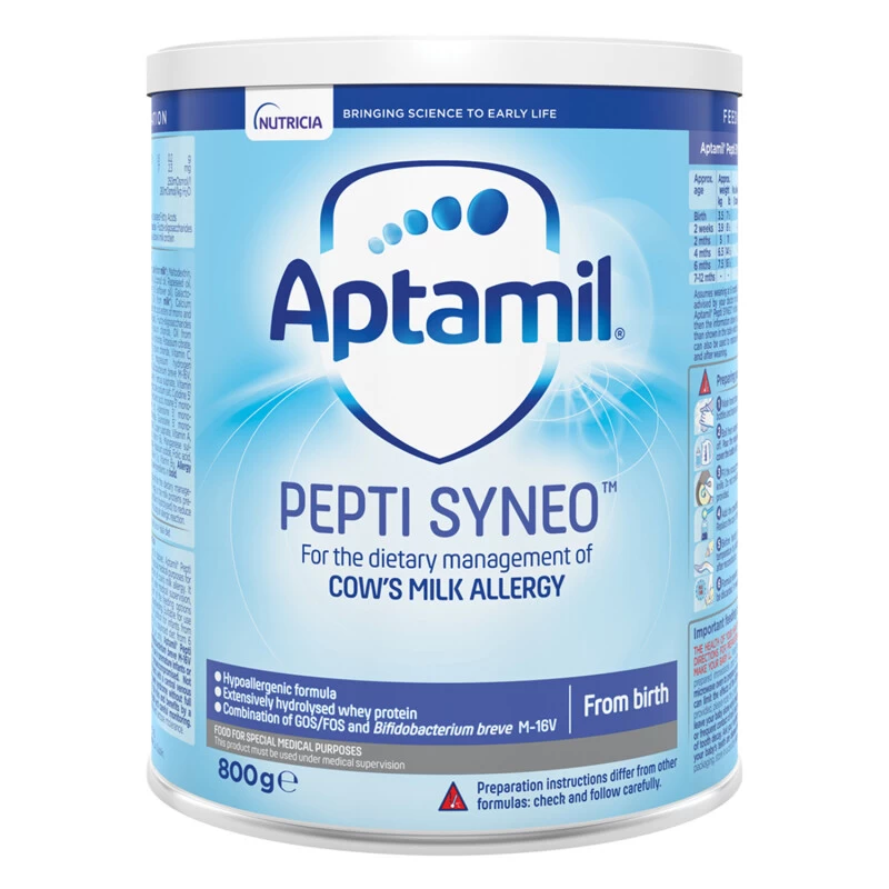 Aptamil Pepti 1 Syneo is a Food for Special Medical Purposes for use under medical supervision. Aptamil Pepti Syneo is a whey-based extensively hydrolysed formula with galacto- and fructo- oligosaccharides (GOS/FOS) and Bifidobacterium breve M-16V, for the dietary management of cow’s milk allergy. Aptamil Pepti Syneo is a nutritionally complete hypoallergenic formula, suitable for infants from birth. Suitable as a sole source of nutrition up to 6 months of age, and/or as part of a balanced diet from 6 months.