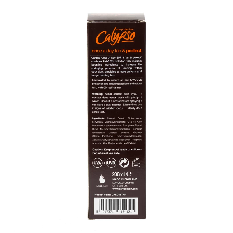 Calypso SPF 15 Once A Day Protect with Tan Extender not only activates and extends natural tanning but is also water resistant and needs only be applied once per day for day long protection.