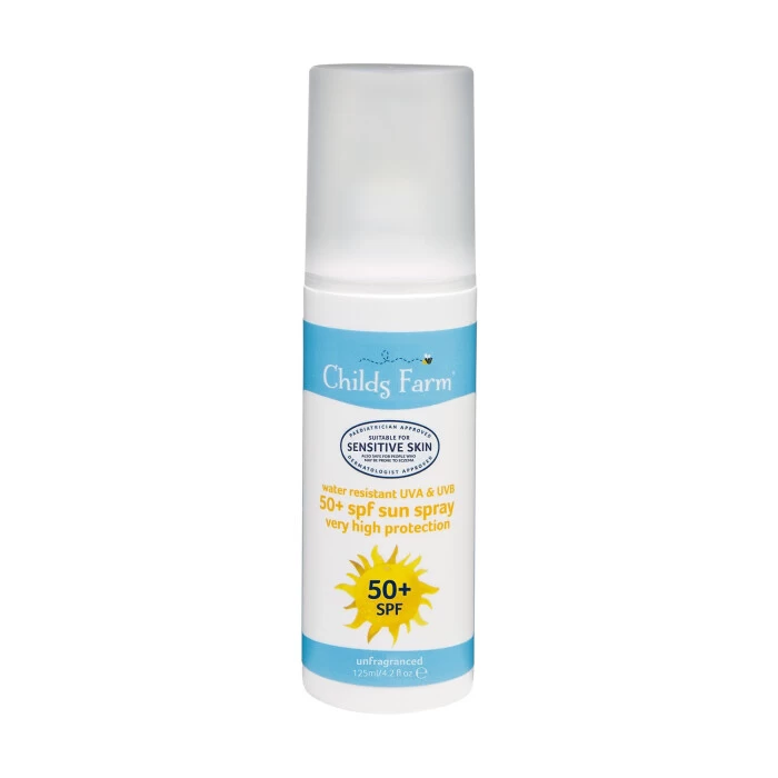 Childs Farm SPF50 Sun Spray for very high protection, is water-resistant and protects young and sensitive skin from UVA and UVB rays, whilst keeping skin moisturised and hydrated.