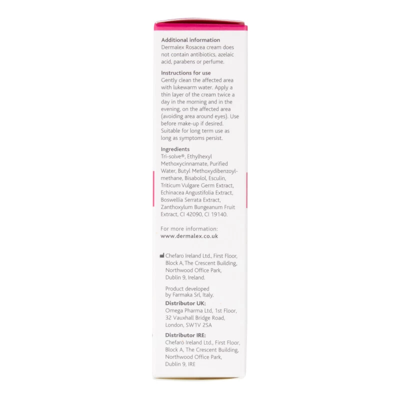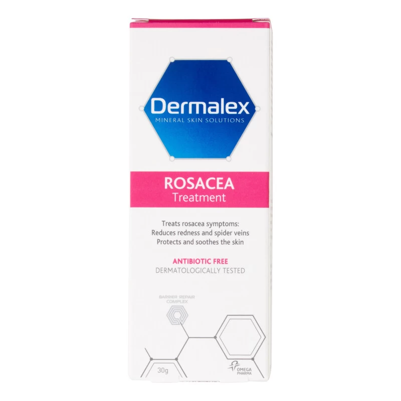 Dermalex Rosacea Treatment reduces the typical symptoms of rosacea by promoting the restoration of the skin’s barrier function. The patented Tri-solve technology creates a protective film on the skin helping to restore a thick and hydrated epidermis. Dermalex Rosacea Treatment also protects the skin through specific UV filters neutralising an important trigger in the appearance of rosacea symptoms. In addition, the cream contains well known soothing and calming ingredients and a green pigment reducing the skin’s redness and helping to increase self confidence. Dermalex Rosacea Treatment is a dermatologically tested product for the treatment of rosacea skin symptoms such as redness, flushing, visible spider veins, tightened and hardened skin and dryness.