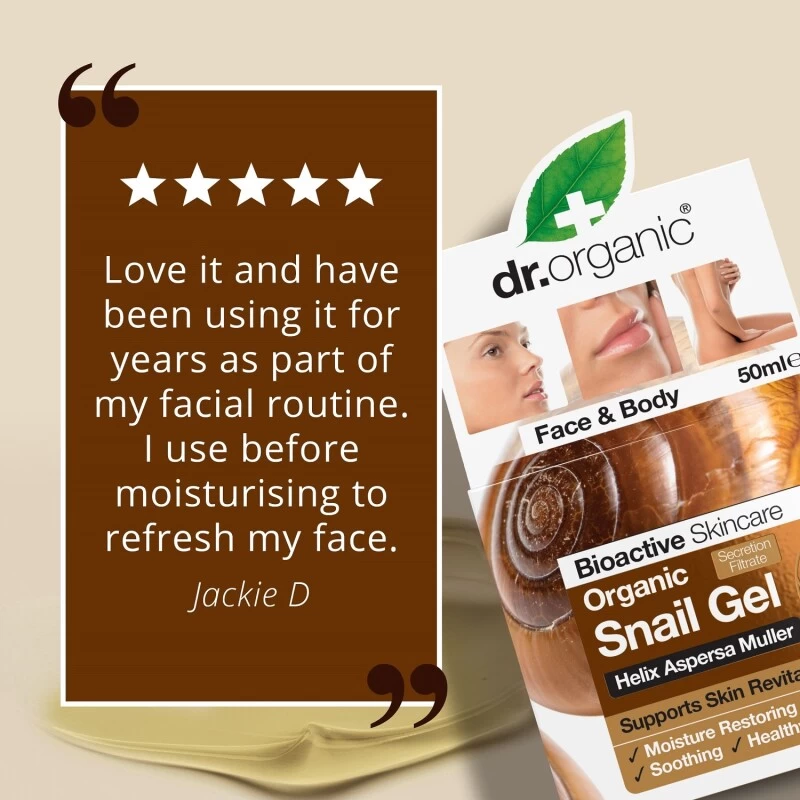 Organic Snail Gel is a moisturising, soothing gel which harnesses the remarkable anti-aging benefits of Helix Aspersa Muller, a unique substance the snail produces to quickly regenerate its own shell and skin. Combined with organic Aloe Vera and our proprietary blend of bioactive ingredients it effectively soothes and hydrates the skin.