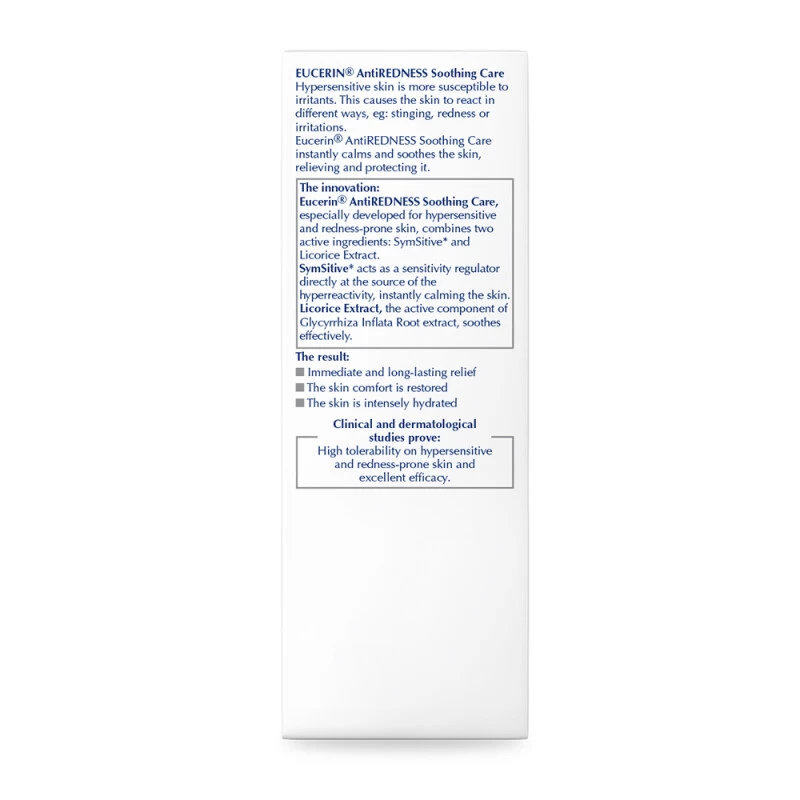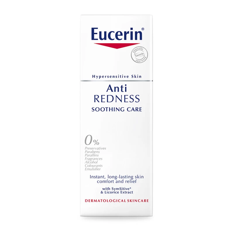 Eucerin AntiRedness Soothing Care is a day and night cream that provides instant comfort for hypersensitive skin, along with redness relief. Hypersensitive skin is caused by a combination of factors including a weakened skin barrier, nerve-fibre hyperresponsiveness and stress inflammation, resulting in hyper-reactivity, redness and irritation.