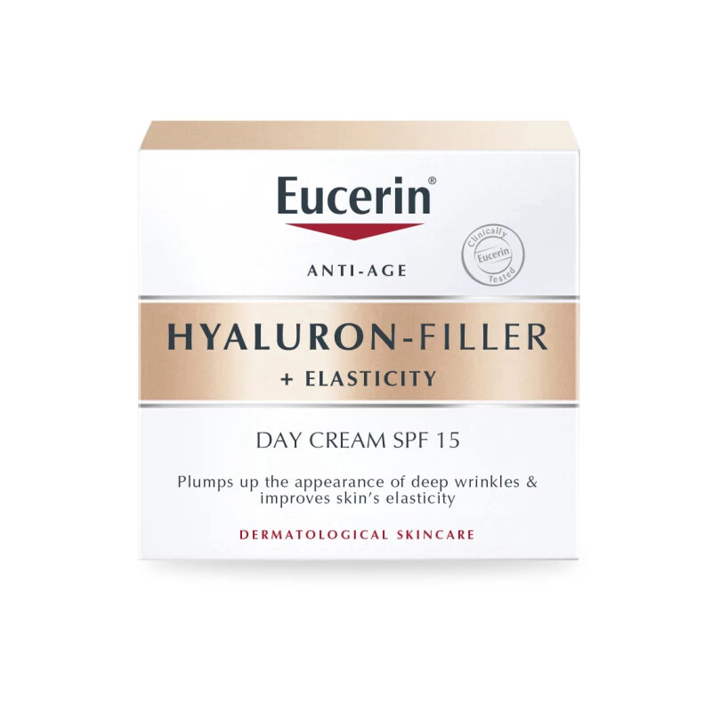 Eucerin Hyaluron-Filler Elasticity Day Cream SPF15 for dry skin is an anti-ageing day cream with SPF15, UVA protection and 3x Effect formula that visibly reduces fine lines and wrinkles for a rejuvenated look. Using an innovative blend of Hyaluronic Acid and Glycine Saponin, the Eucerin Hyaluron-Filler day cream delivers a more targeted approach to visibly plumping even deep wrinkles.