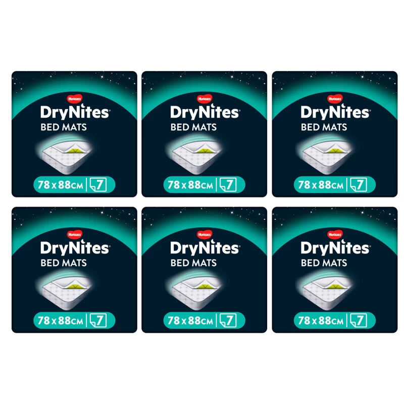 Huggies DryNites Bed Mats are a disposable, thin cotton-feel sheet approximately 78cm x 88cm, which fit across the width of your little one?s mattress under the bed sheet, with the new peel-off adhesive back sheet secures the Bed Mat to a mattress, to hold it in place for great night-long protection.