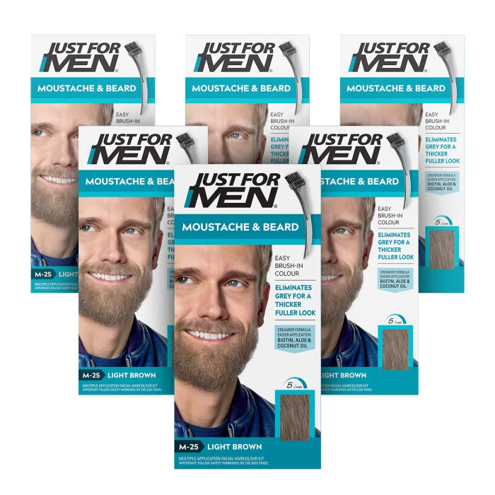 Just For Men Moustache & Beard Light Brown Hair Dye M-25 6 Pack matches the same Just for Men head hair colour. It is specially designed for facial hairs and targets only grey hairs and replaces them with subtle tones that match your own natural hair colour in just 5 minutes! This penetrating formula lasts until the grey hairs grow back, but you get multiple applications from every box to continue your natural look. Just For Men?s Gel is easily applied and conditions as it colours to leave your facial hair in great condition once coloured.