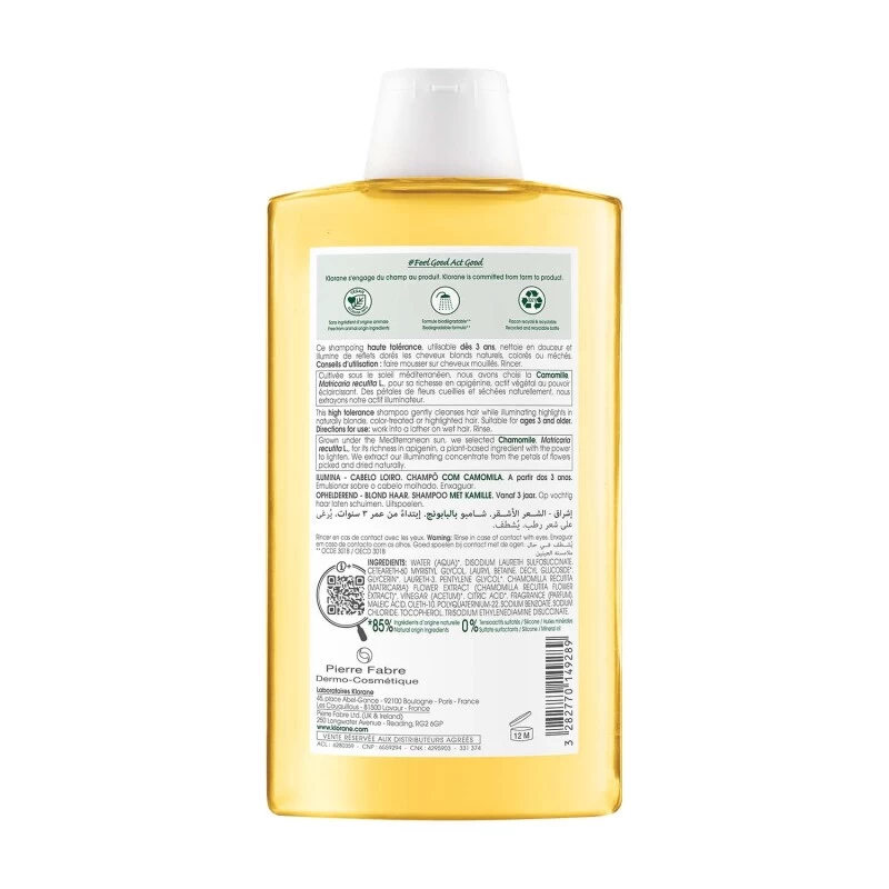 Klorane Camomile Shampoo gives your hair a golden shine and softness. It cleans and detangles hair leaving it fresh and illuminating. With concentrated camomile, that has been used to naturally lighten hair for many years, this shampoo works by nourishing the hair and bringing back its softness and shine. The lightweight formula doesn’t weigh down hair and is perfectly adapted to blonde hair. For the whole family from 3 years old. Klorane Shampoo is free of synthetic colourants and bleaching agents. It contains no silicone, parabens, sodium chloride or SLS.