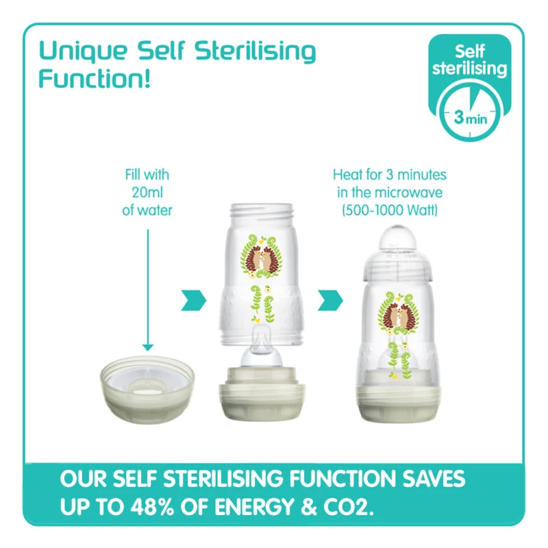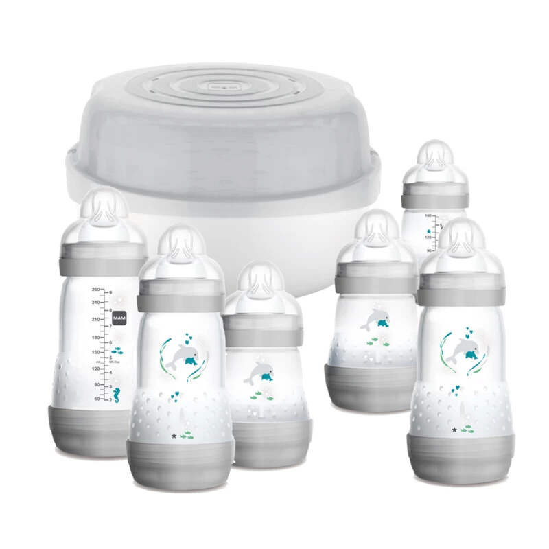 MAM Easy Start Bottle & Microwave Steriliser Set is the perfect companion for parents who want to bottle feed and sterilise their bottles. This set includes the steriliser, 3 Easy Start Anti Colic 160ml bottles and 3 Easy Start Anti Colic 260ml bottles. This easy to use device kills 99.9% of germs in as little as 5 minutes. Up to 6 MAM bottles can be cleaned and hygienically stored for up to 48 hours, and the compact design makes for easy storage when not in use. The lid is safe and easy to use with handy latches, and it can also be used to drain the sterilised items. When travelling, this steriliser can also be used as a cold water steriliser.