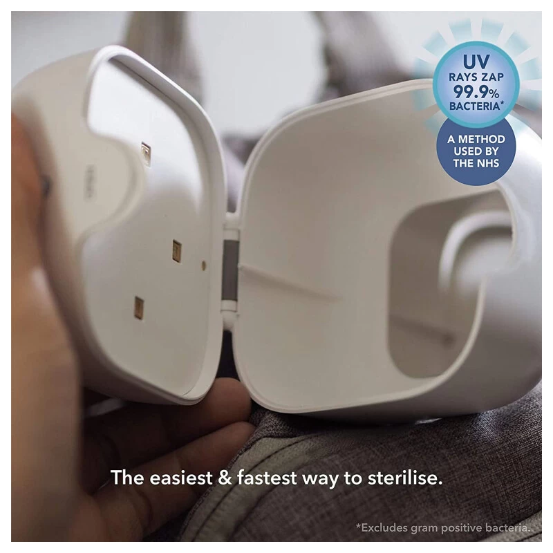 Nuby UV Soother Pod sterilises your baby’s soother (dummy) in just 1 minute without the need for water or a microwave. This completely portable pod comes with a handy strap, meaning you can attach it to a buggy or bag and have it on hand whenever you need it! UV rays zap 99.9% of bacteria to kill them with no chemicals, no cooling time, and no drying required.