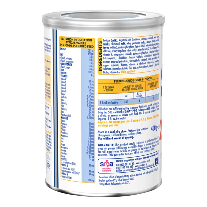 SMA PRO Follow On Milk is enriched with essential nutrients to support 3 main areas at this stage in your baby’s development: development, immunity and growth. Iron supports normal cognitive development, Vitamins A, C & D support normal function of the immune system, Vitamin D and Calcium support normal growth and development of bones, and Omega 3 & 6 helps to support normal growth.