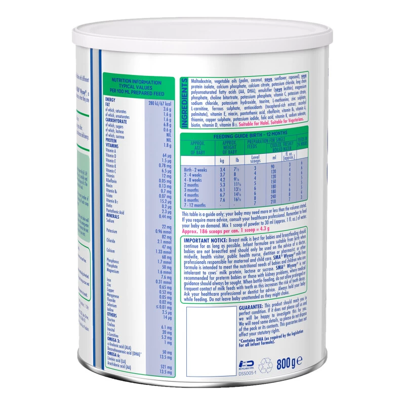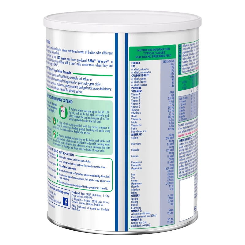 SMA Wysoy Formula is a nutritionally complete soya formula for the dietary management of cows’ milk intolerance. It is suitable for use for milk protein intolerance, lactose and sucrose intolerance, galactosaemia and galactokinase deficiency. This formula can be used as the sole source of nutrition from birth and can be mixed with foods during weaning.
