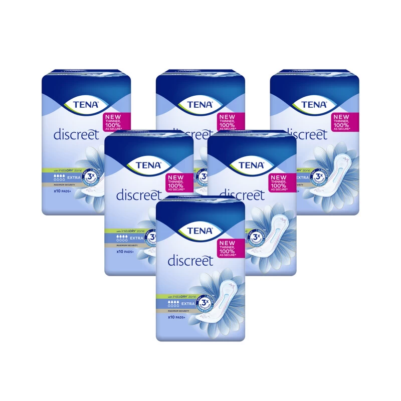 TENA Discreet has a body shaped DRYZone for excellent absorption and discretion, paired with Fresh Odour Control, provides Triple Protection from leaks, odour and moisture. TENA Discreet pads adapt to the shape of your body using their elasticated sides to gently follow the movement of your body. They are also made with a dermatologically tested, silky soft, breathable material to prevent moisture and promote skin health.