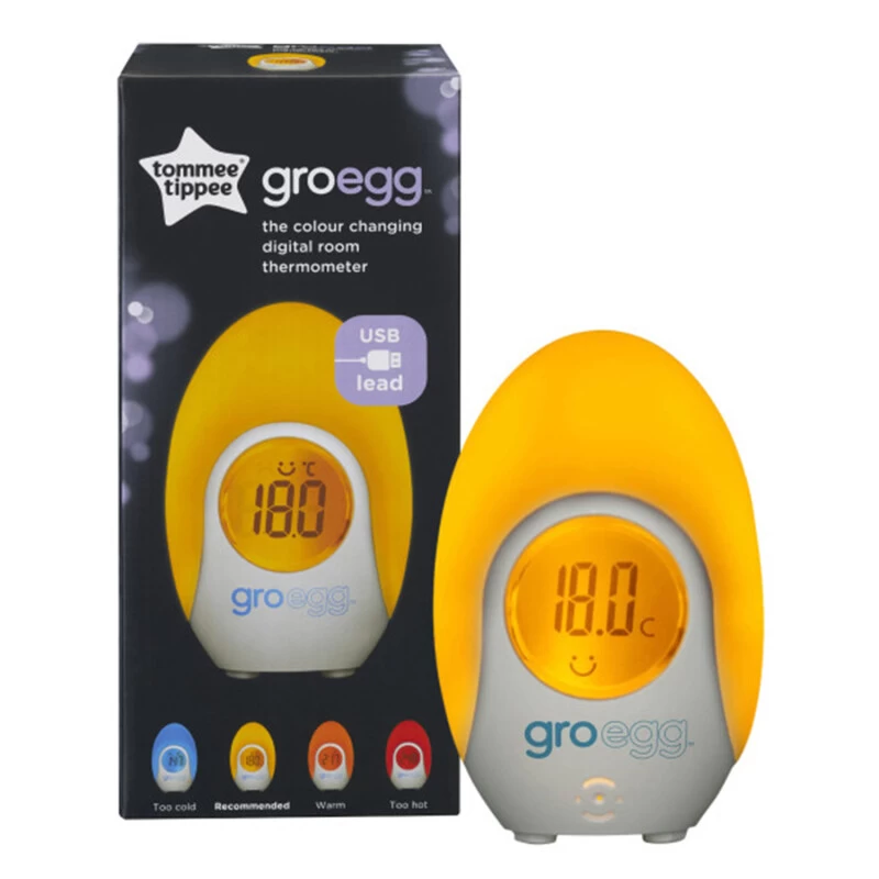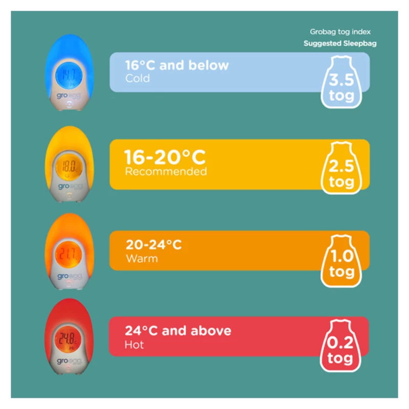 The Tommee Tippee Groegg digital room thermometer changes colour to indicate the temperature of the room so you can adapt your child’s bedding, clothing or room temperature accordingly. This room thermometer features a permanently lit LED display for an accurate temperature reading of the room. The colour changing temperature display on the Groegg helps parents to follow a safer sleep routine. The colour that is shown represents a temperature range as follows: