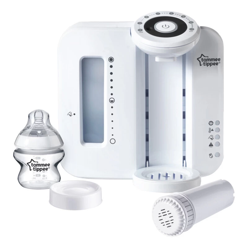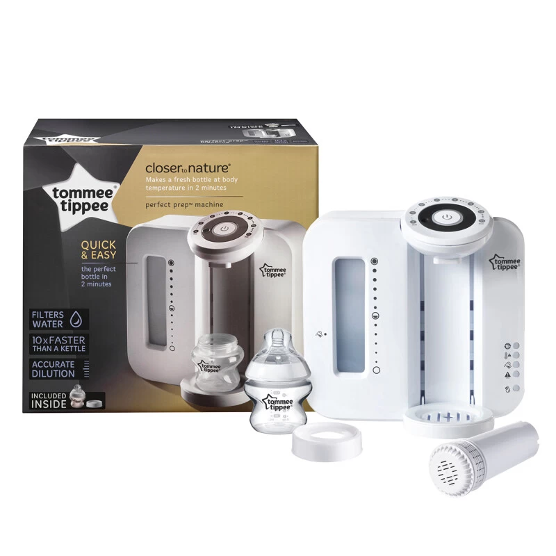 No more juggling a hungry baby in one arm and trying to make a bottle of formula with the other. The Tommee Tippee Perfect Prep Machine – White provides a fresh bottle of formula for your baby at the perfect temperature in less than two minutes flat. Ten times faster than boiling a kettle and waiting for it to cool. The Perfect Prep? machine dispenses an initial ‘hot shot’ of water that kills any bacteria that may be present in the formula. The initial burst of hot water also helps to dissolve the formula quickly and easily. The in-built filter system removes impurities from water, and dispenses the correct amount of water for accurate formula consistency. No wonder parents call the Perfect Prep machine a lifesaver!