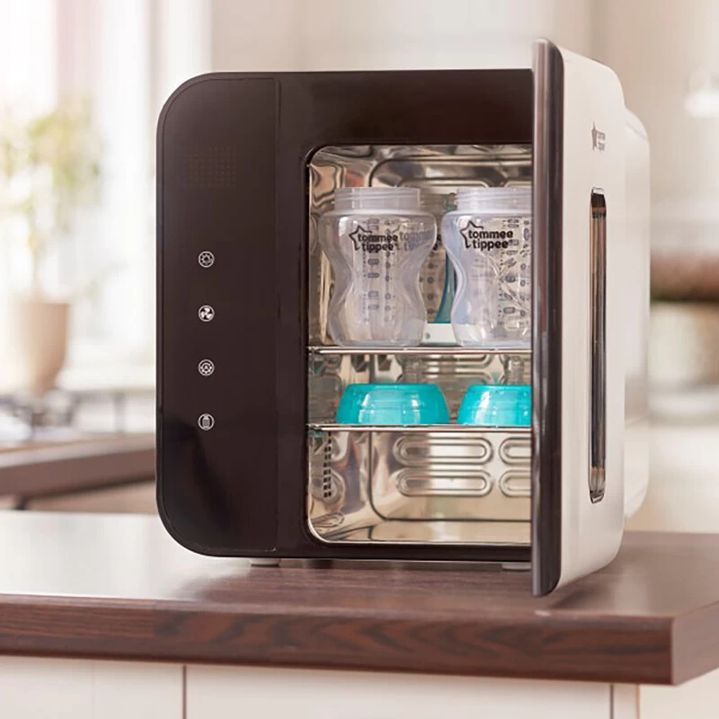 - Tommee Tippee UV Steriliser is suitable for a wide range of branded bottles, soothers and breast pump accessories and features adjustable shelves.